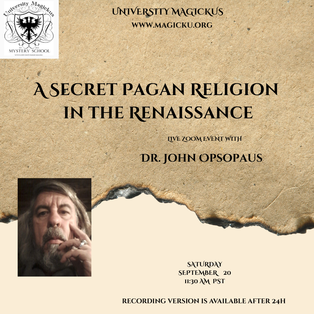 Join us Saturday September 20th @ 11:30am PST / 2:30pm EST for A Secret Pagan Religion in the Renaissance with Dr. John Opsopaus