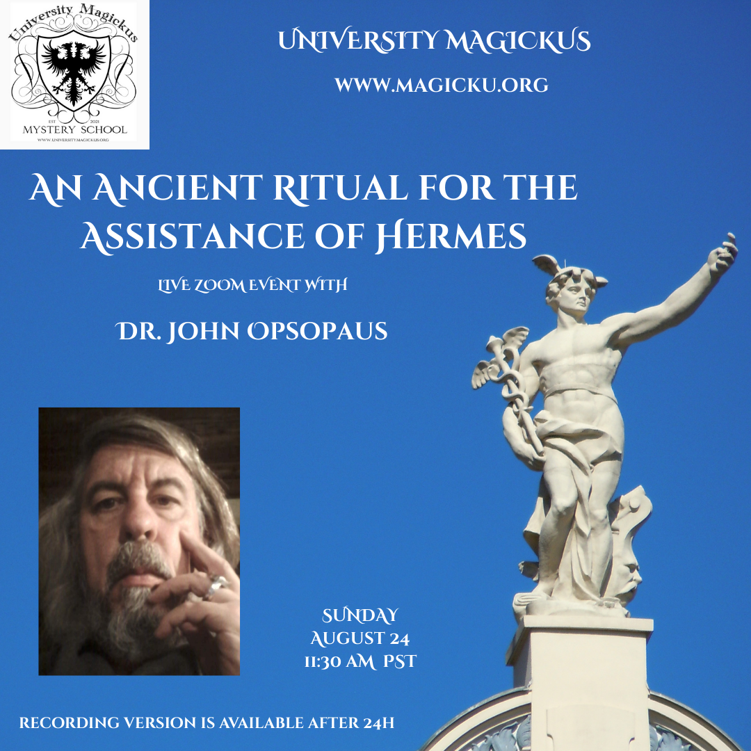 Join us Sunday August 24th @ 11:30am PST / 2:30pm EST for An Ancient Ritual for the Assistance of Hermes with Dr. John Opsopaus