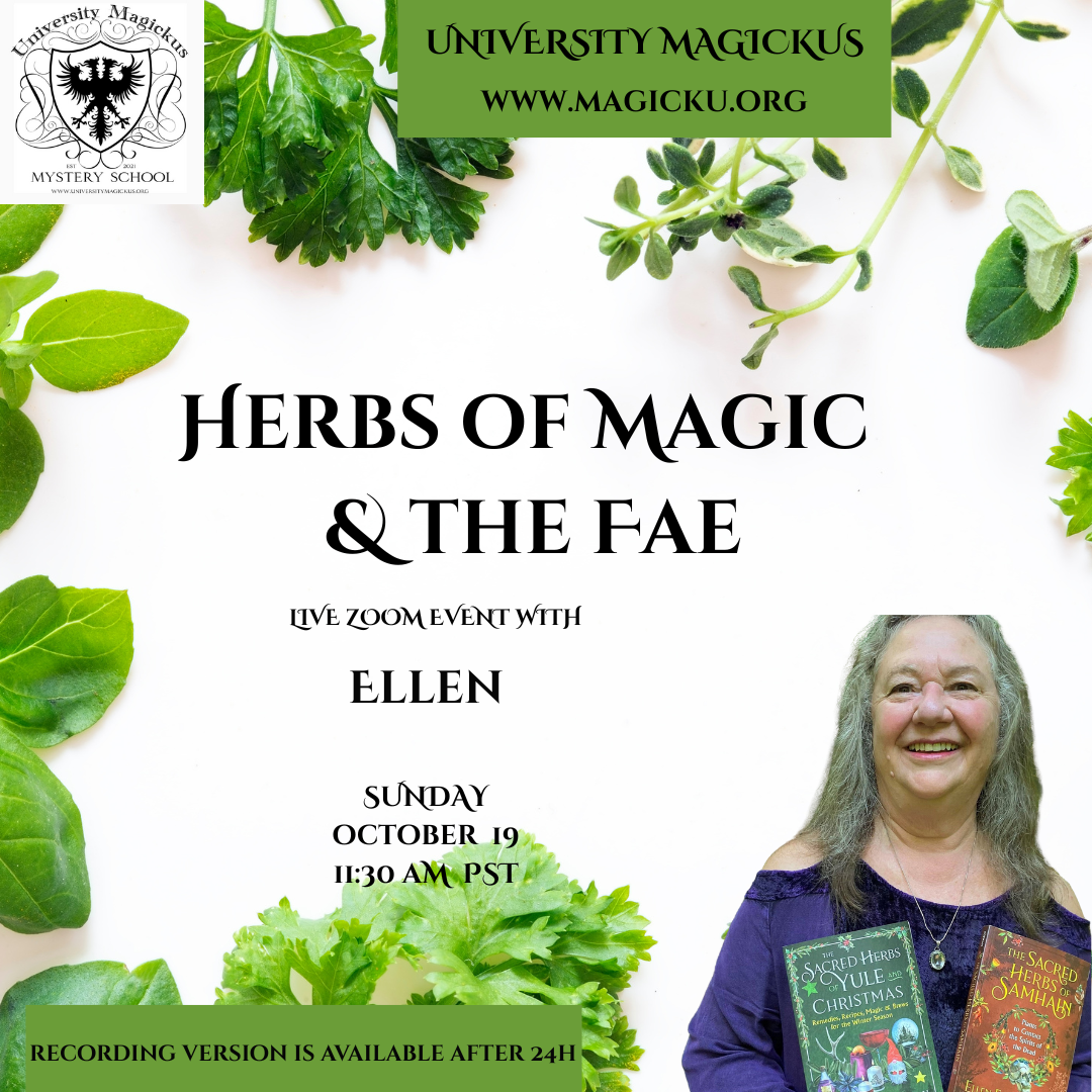 The basics of herb magic will be covered and participants will learn how to approach any plant and use it for magic. Ellen will also cover traditional herbs to use for luck, magic, protection, purification, abundance, fertility, and love, as well as the herbs of the Faeries and Elves and herbs for journeying to the Otherworld and for contacting the High Gods and Goddesses.