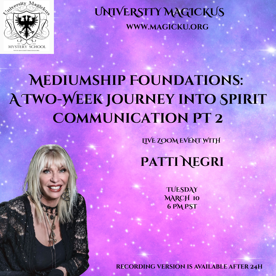 Join us Tuesday March 10th @ 6:00pm PST / 9:00pm EST for Mediumship Foundations: A Two-Week Journey into Spirit Communication PT2 with Patti Negri